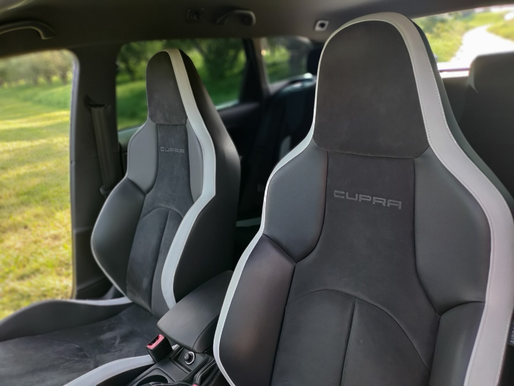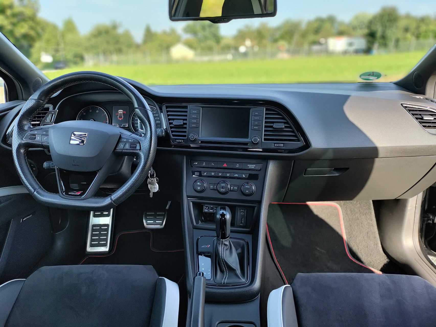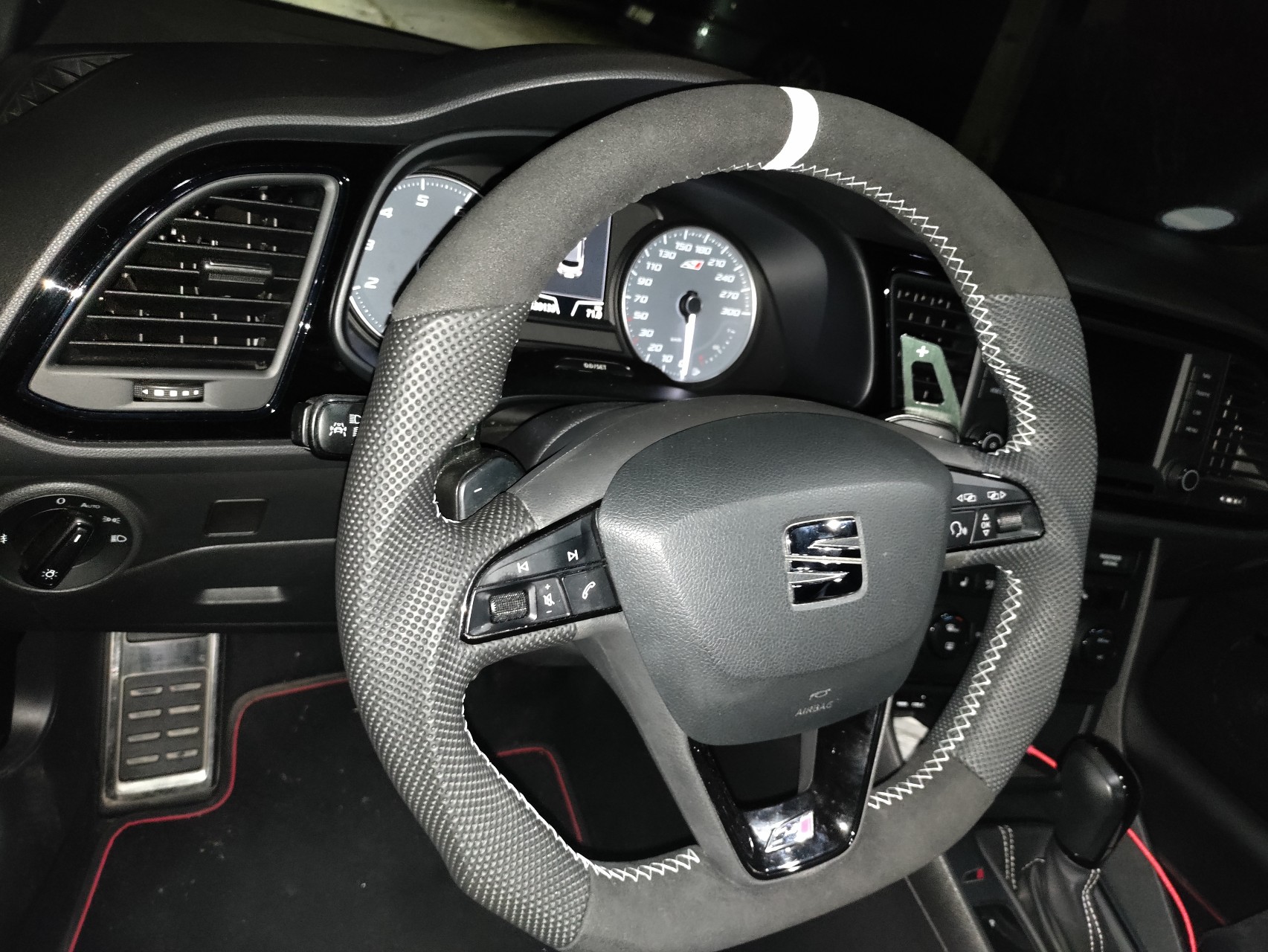 - Neu bezogenes Lenkrad in Alcantara und genopptem Stoff an den Griffflächen sowie 12-Uhr-markierung in weiß (NP 2021: 350€)