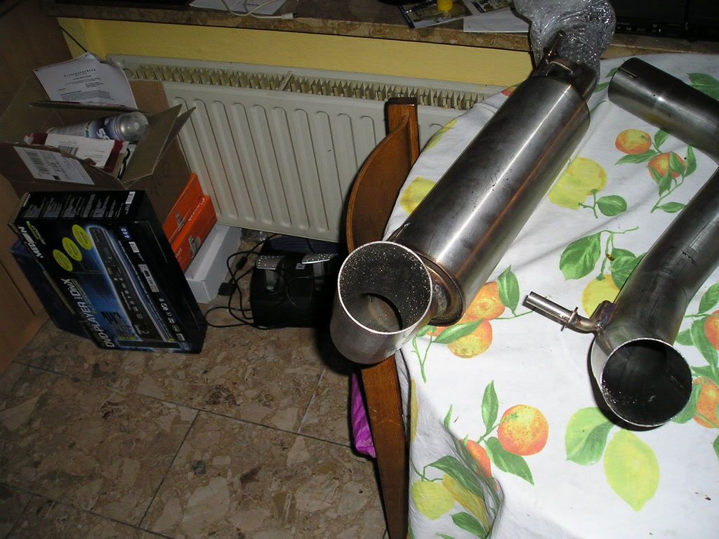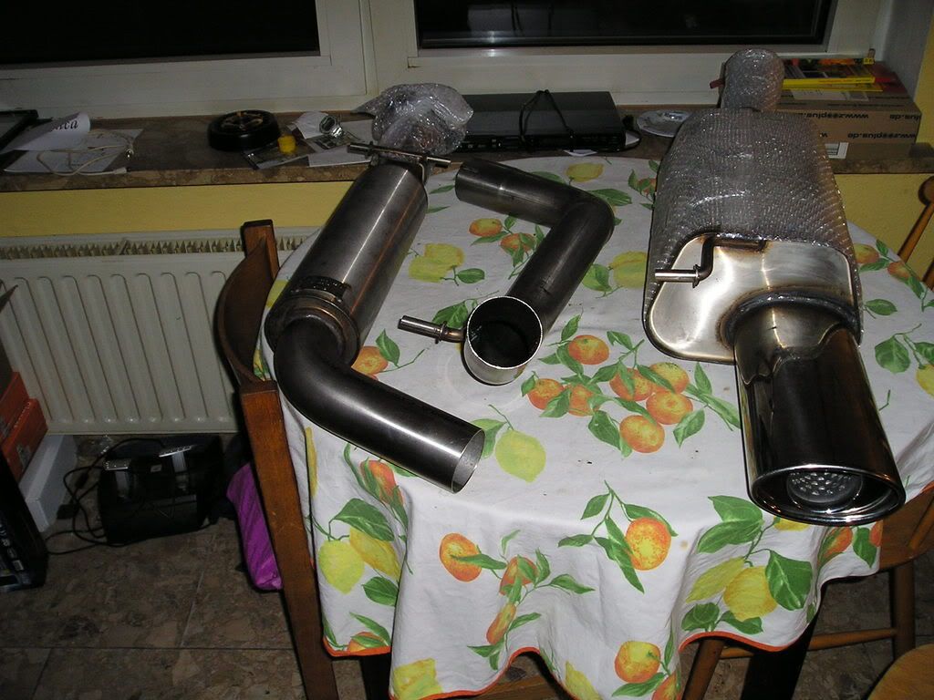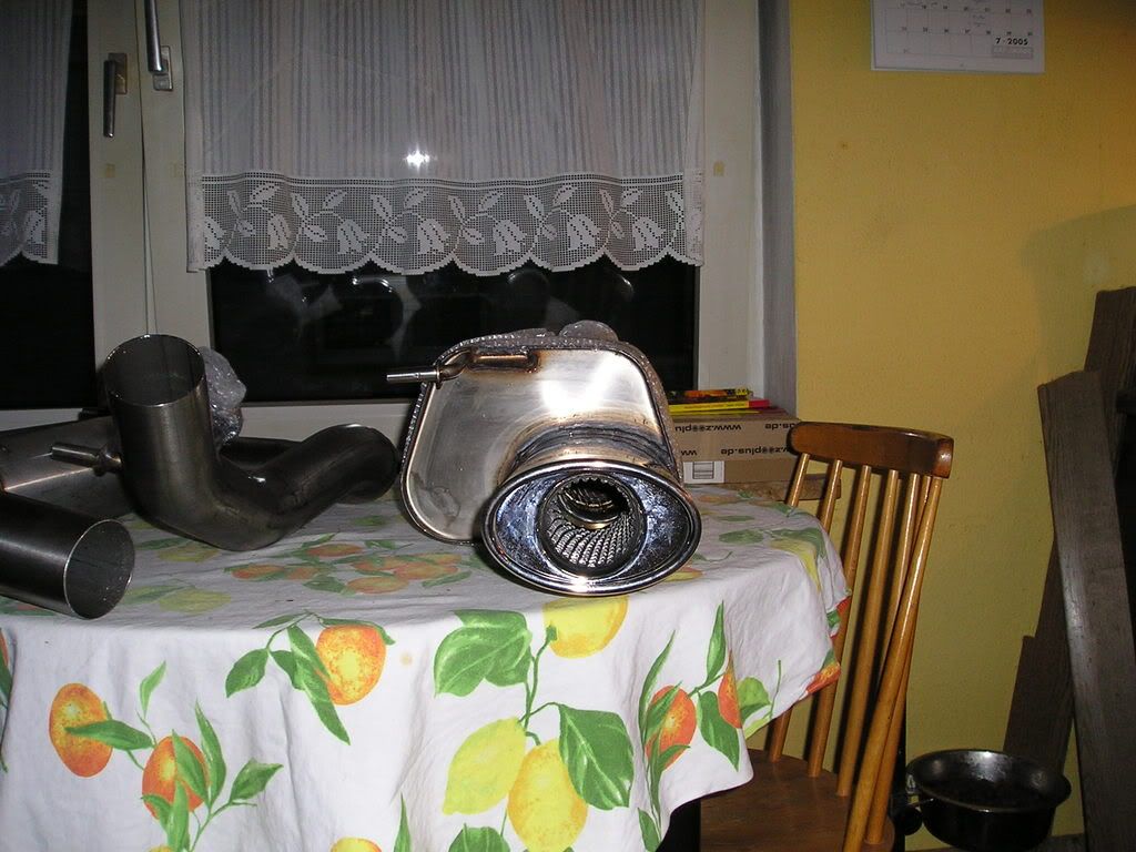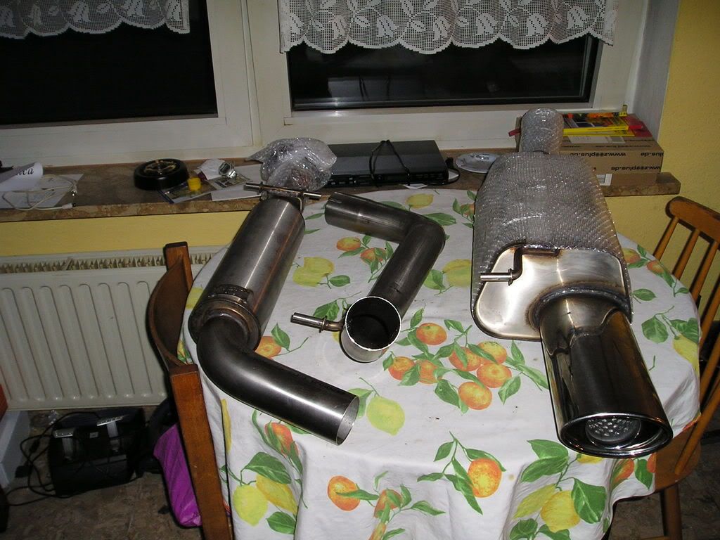 Habe heute meine neue Auspuffanlage bekommen.Ab Kat 70 mm durchmeser in edelstahl.Hab ein paar Bilder gemacht,sorry ist nicht aufgeräumt (Hintergrund).Werd das Teil morgen einbauen und dann berichten.