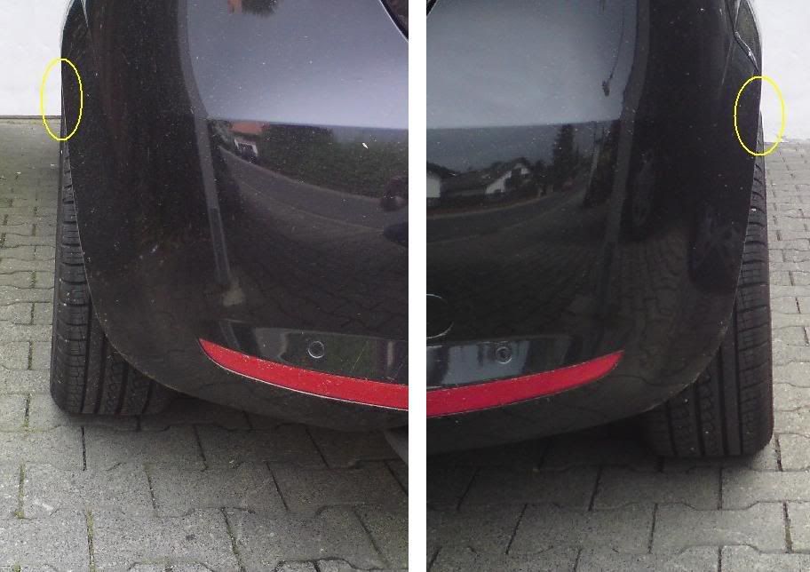 erst nach der Tieferlegung und der Spurverbreiterung fiel mir auf, dass das rechte Hinterrad ca. 1cm weiter aus dem Radhaus steht wie das linke (siehe Bilder weiter unten). Man sieht deutlich, dass das rechte Rad oben fast mit der Radhauskante abschließt, während das linke Rad innerhalb des Radhauses liegt. Es könnte auch sein, dass das vorher schon so war, aber die Spurplatten machen es erst richtig deutlich. Ich habe nochmal mit meiner "Tieferlegungs- und Verbreiterungswerkstatt" gesprochen, und am morgigen Samstag soll noch einmal eine Achsvermessung durchgeführt werden, und ich bin jetzt schon auf die derzeitigen Sturzwerte der Hinterräder gespannt. Seit der letzten Vermessung nach der Tieferlegung und Verbreiterung bin ich ca. 1.200 km gefahren. Bei der Vermessung hatte ich hinten links -1°47' und hinten rechts -1°30'. Es könnte natürlich auch sein, dass die Achse ein wenig nach rechts versetzt ist (ich glaube, bis 6mm geht die Toleranz). Dann könnte es schon sein, dass das rechte Rad 6mm weiter raus geht und das linke 6mm weiter rein. Wenn man ein paar Meter hinter dem Wagen steht und jeweils auf die Hinterräder schaut, haben sie schon beide rein optisch jeweils ordentlich Negativsturz. Na ja, ich warte mal morgen die Vermessung ab, dann weiß ich mehr. Vielleicht kann man ja auch rechts den Sturz ein klein wenig mehr negativ und links etwas mehr positiv einstellen, damit es nicht ganz so sehr auffällt. Ach so: Bei den Spurplatten wurde kein Fehler gemacht. Es sind jeweils H&R 20mm-Platten.
