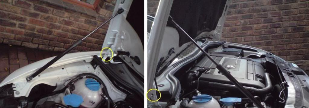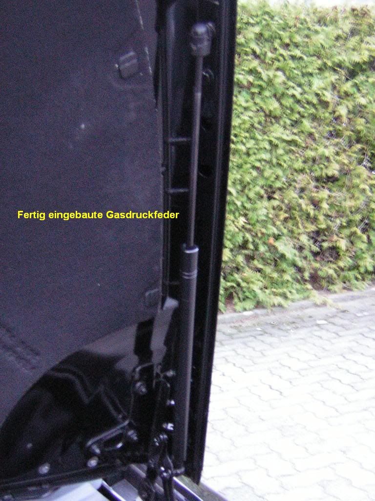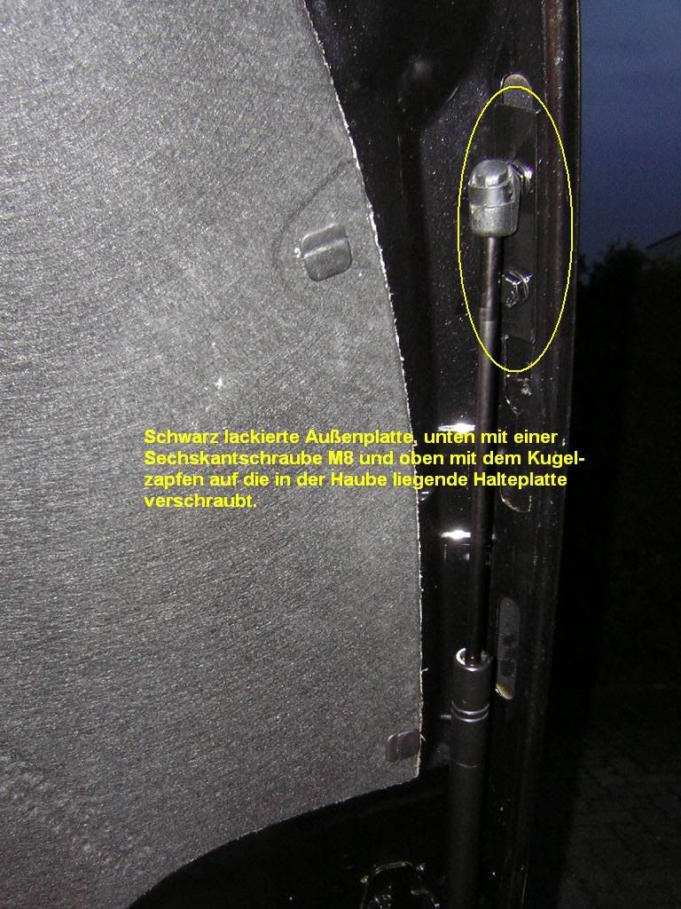 Wenn man innen im Wagen den Entriegelungshebel zieht, bleibt die Motorhaube erstmal im Fanghaken hängen - so wie auch vor dem Einbau der Gasdruckfedern. Das muss so sein, sonst würde die Haube beim versehentlichen Öffnen und anschließenden Losfahren oder sogar beim versehentlichen Öffnen während der Fahrt Dir um die Ohren fliegen. Die Fanghakensicherung bleibt also zu 100% erhalten. Hat man vor dem Wagen stehend den Enriegelungshaken gelöst und man hebt die Haube 20-30cm an, fährt sie von selbst nach oben, knallt jedoch nicht in die Endanschläge. Wenn man mag, kann man die letzten Zentimeter die Haube mit der Hand bis in den Anschlag drücken. Die Haube wird auf alle Fälle sicher in dieser Position gehalten. Zum Schließen der Motorhaube diese einfach mit den Händen nach unten drücken - ca. 20-30cm vor dem Schließen ist die Kraft der Gasdruckfedern überwunden und die Haube fällt ins Schloss.