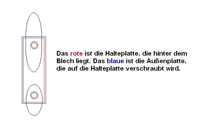 Die Bohrungen haben einen Abstand von 48mm Mitte Bohrloch bis Mitte Bohrloch. Damit liegt das Gewinde des Kugelzapfens ziemlich genau am Rand der Mulde der oberen Aussparung. Viel weiter dürfen die Bohrungen nicht auseinander liegen, da zu den Rändern der Halteplatte noch genügend Material vorhanden sein muss und die Platten nicht viel länger als 70mm sein dürfen, denn dann passen sie nicht mehr in die lange ovale Aussparung.