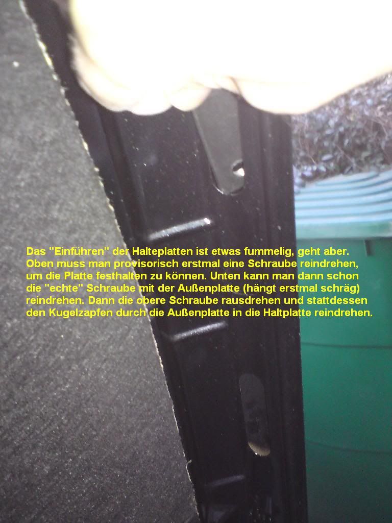 Ich habe das erste kurze ovale Loch in Kombination mit dem ersten langen ovalen Loch gewählt. Die Relation stimmt dann perfekt. Was noch wichtig ist: Bei dieser Wahl der Langlöcher sitzen die Kugelzapfen exakt im Abstand der ausgefahrenen Länge der Gasdruckfeder. Die Federn drücken wie gesagt mit einer Kraft von 540N = 54 kg. Wenn die Gasdruckfeder auf einen der Kugelzapfen geclipt ist, bekommt man sie keinen Millimeter zusammengedrückt, falls der Abstand der Kugelzapfen zu klein sein sollte. Der logische Gedanke wäre ja: Der Abstand der Kugelzapfen ist 1cm zu klein, macht nix, dann drücke ich die Feder halt ein wenig zusammen und klemme sie auf die Zapfen. Gleich wieder vergessen! Bei 540N unmöglich. Man bekommt die Feder gerade ein klein wenig zusammengefahren, wenn man sie im rechten Winkel auf den Boden hält und sich mit dem Körpergewicht draufstützt! Bei Entlastung fährt die Feder dann sofort wieder auseinander. Federn bis 300N kann man noch mit ziemlichem Kraftaufwand zusammendrücken, wenn sie auf einem der Kugelzapfen sitzen, Federn mit 540N aber nicht mehr.