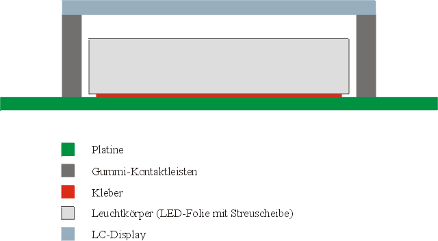 Problem: die Beleuchtung ist unter dem LC-Display auf die Platine geklebt (Skizze). Das Display-Glas liegt auf zwei Gummileisten, die zig Kontakte zur Verbindung der Platine mit dem Display enthalten. Wenn man das auseinander nehmen sollte, kriegt man es garantiert nie mehr zusammen! Also muß man die Beleuchtung unter dem Display demontieren... ;(