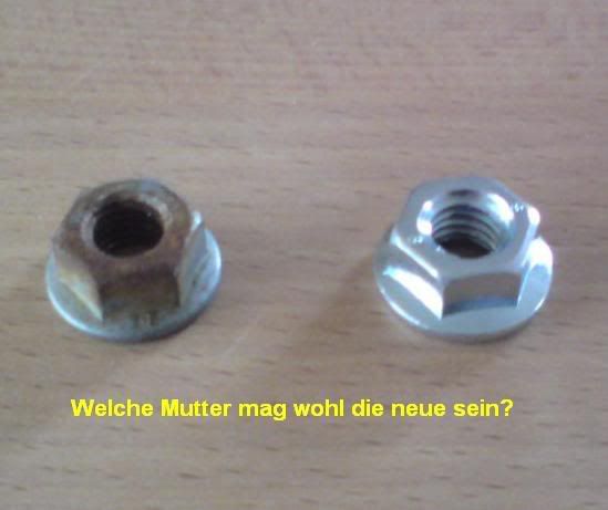 Keine Ahnung, was die bei Seat da draufzwiebeln. Jedenfalls fing die Mutter bereits nach kürzester Zeit zu gammeln an. Ich habe sie 1-2mal entrostet, aber wenn die Pest erst mal angefangen hat, nun das kennen wir ja... Erschwerend kommt noch hinzu, dass im Winter natürlich der ganze Salznebel am Heck nach oben wirbelt und das fördert das Gammeln erst recht. Aber was solls: Die Mutter kostet nur ein paar Cent und wenn auch die neue irgendwann mal Verwesungserscheinungen bekommt, dann verpasse ich dem Wischer halt wieder eine neue. Ich bin keiner, der wegen sowas in die Werkstatt fährt. Für den Sprit bekomme ich ein ganzes Kilo Muttern.